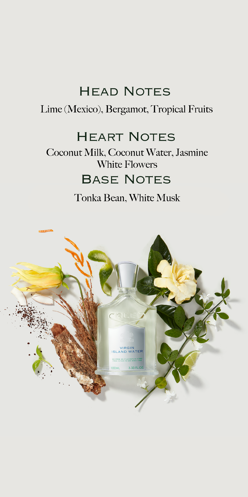 Virgin Island Water by Creed is a Citrus fragrance for women and men. Virgin Island Water was launched in 2007. Virgin Island Water was created by Olivier Creed and Erwin Creed. Top notes are Coconut, Lime, White Bergamot and Sicilian Mandarin; middle notes are Ginger, Ylang-Ylang, Indian Jasmine and Hibiscus; base notes are White Rum, Sugar Cane and Musk.