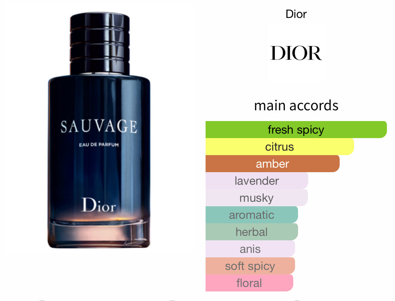 Sauvage Eau de Parfum by Dior is a Oriental Fougere fragrance for men. Sauvage Eau de Parfum was launched in 2018. The nose behind this fragrance is François Demachy. Top note is Bergamot; middle notes are Sichuan Pepper, Lavender, Star Anise and Nutmeg; base notes are Ambroxan and Vanilla.