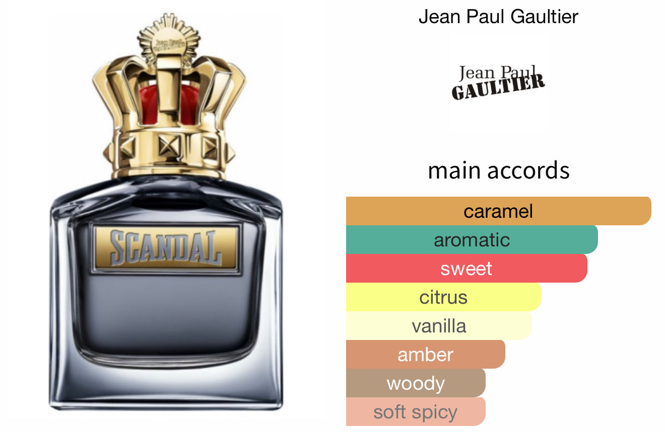 Scandal Pour Homme by Jean Paul Gaultier is a Oriental Woody fragrance for men. Scandal Pour Homme was launched in 2021. Scandal Pour Homme was created by Quentin Bisch, Christophe Raynaud and Natalie Gracia-Cetto. Top notes are Mandarin Orange and Clary Sage; middle notes are Caramel and Tonka Bean; base note is Vetiver.