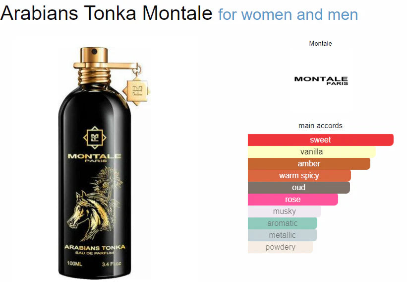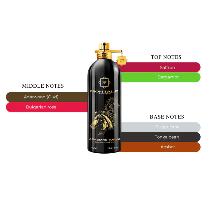 Arabians Tonka by Montale is a Oriental Woody fragrance for women and men. Arabians Tonka was launched in 2019. Top notes are Saffron and Bergamot; middle notes are Agarwood (Oud) and Bulgarian Rose; base notes are Tonka Bean, Sugar Cane, Amber, White Musk and Oakmoss.