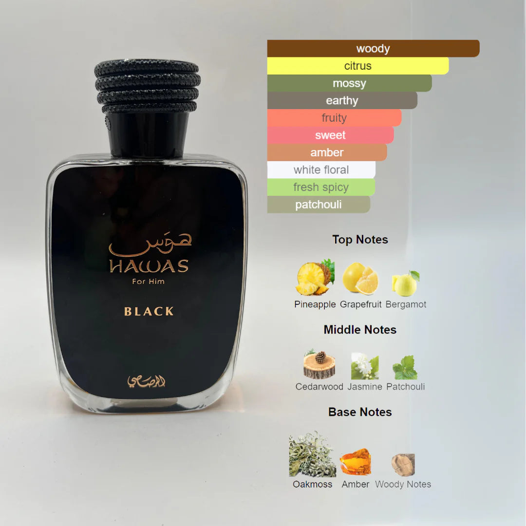 Hawas Black by Rasasi is a fragrance for men. This is a new fragrance. Hawas Black was launched in 2024. Top notes are Pineapple, Bergamot and Grapefruit; middle notes are Cedarwood, Patchouli and Jasmine; base notes are Oakmoss, Woody Notes and Amber.
