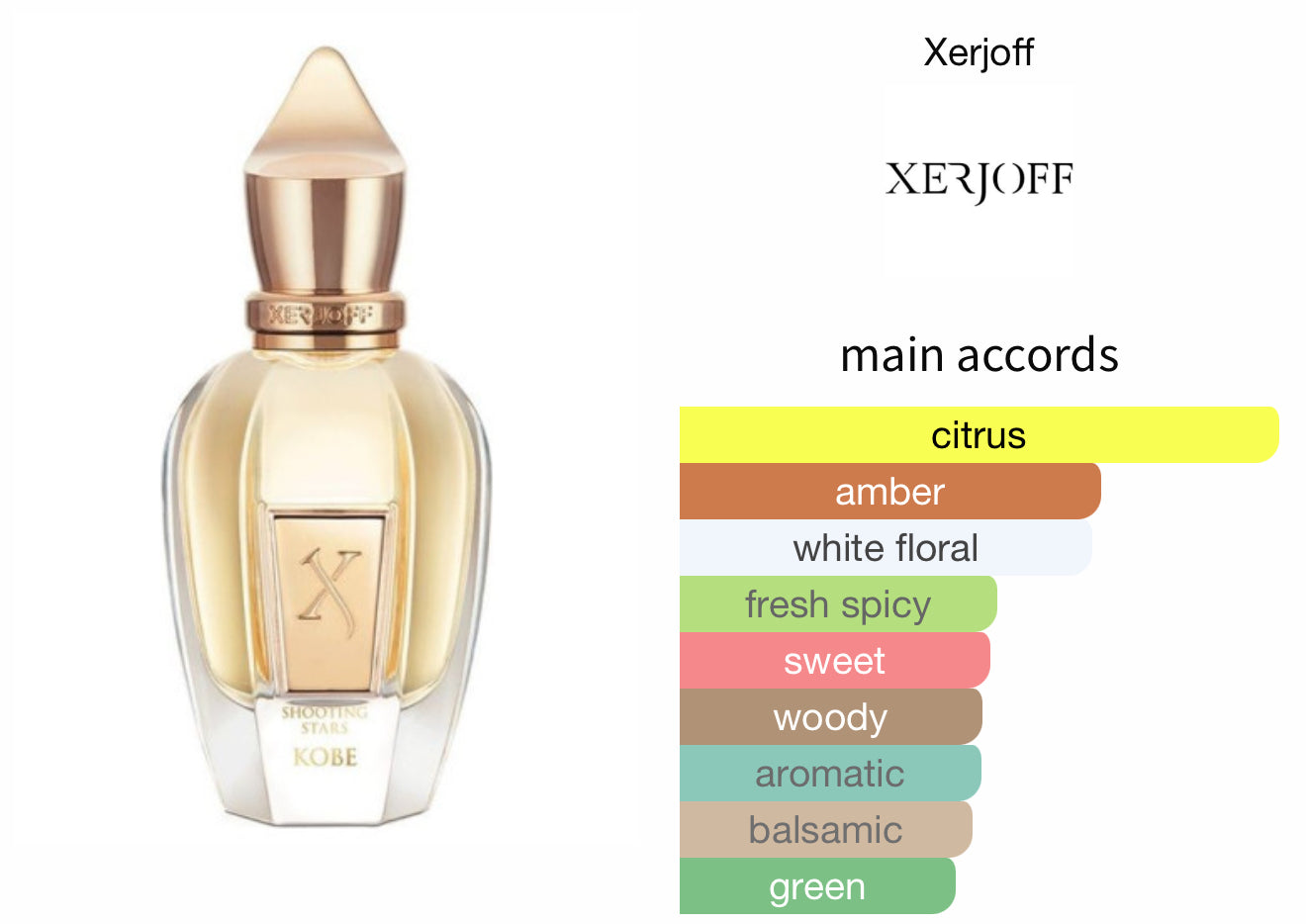 Kobe by Xerjoff is a Citrus Aromatic fragrance for men. Kobe was launched in 2009. Top notes are Orange, Bergamot and Labdanum; middle notes are Neroli, Petitgrain and Orange Blossom; base notes are Brazilian Rosewood, Benzoin, Tonka Bean, Ambergris, Agarwood (Oud), Musk and Styrax.