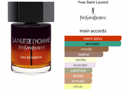 La Nuit de L'Homme Eau de Parfum by Yves Saint Laurent is a Oriental Woody fragrance for men. La Nuit de L'Homme Eau de Parfum was launched in 2019. Top notes are Cardamom and Grapefruit; middle notes are Leather, Lavender and Clary Sage; base notes are Tonka Bean, Sandalwood, Patchouli and Vetiver.